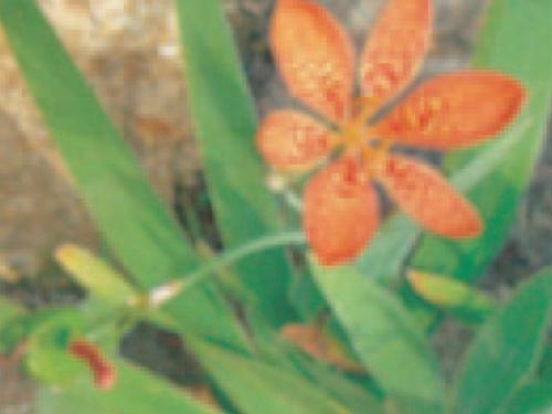 칼 모양의 잎은 넓고 부채처럼 펴진 잎모는 매우 뛰어나며 주황색꽃은 무늬가 좋고 열매도 관상 가치가 높다.
